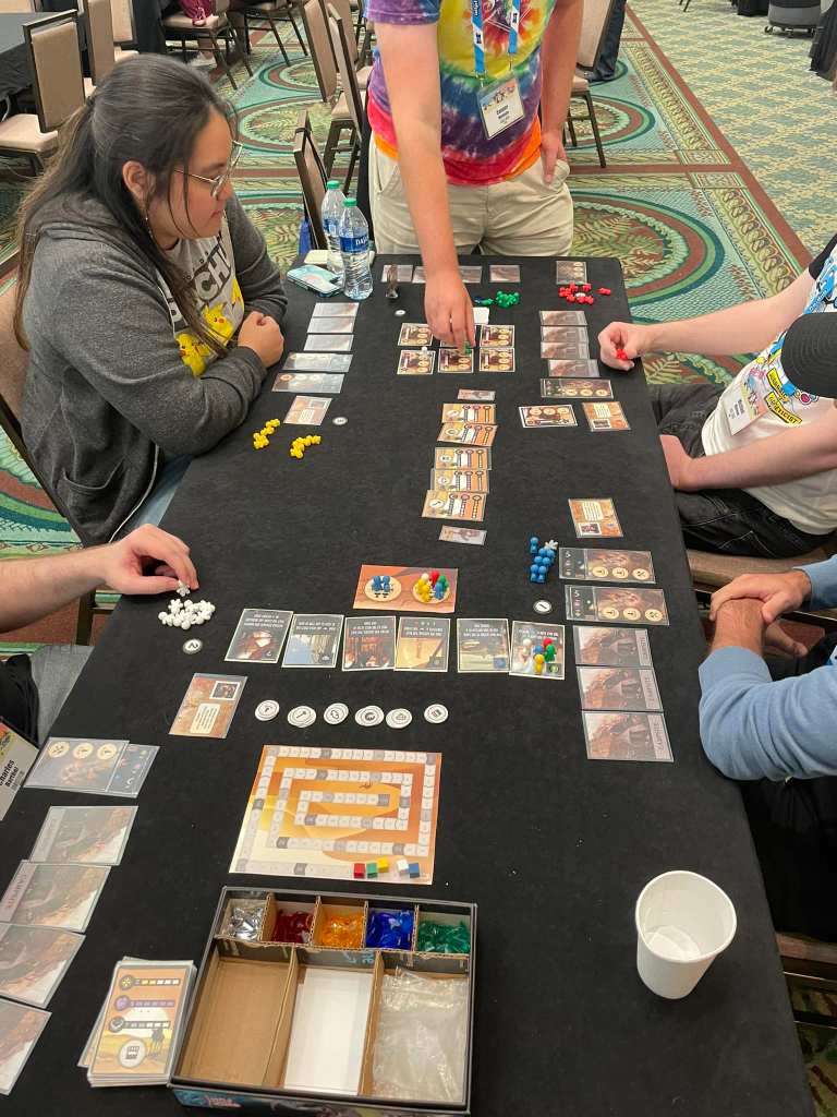 At the end of each round, players will turn in the gems they have collected to various Artisans they have workers at, gaining Victory Points. After 3 rounds, the player with the most Victory Points is the winner!