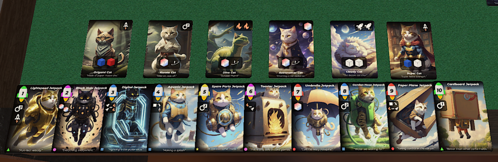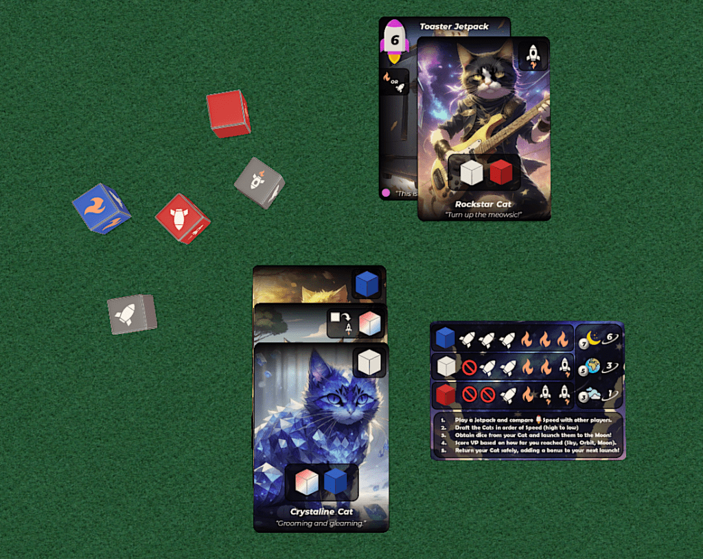 During each of the 8 rounds, players will be choosing a Jetpack from their hand to gain draft priority on one of the Cats in the center of the table. This is the cat that you will launch to the moon! Using that Cat, your Jetpack bonus and any other Cat-Base bonuses you have earned, you will roll your assigned dice for that round attempting to combing Fuel and Rockets to create a Launch!